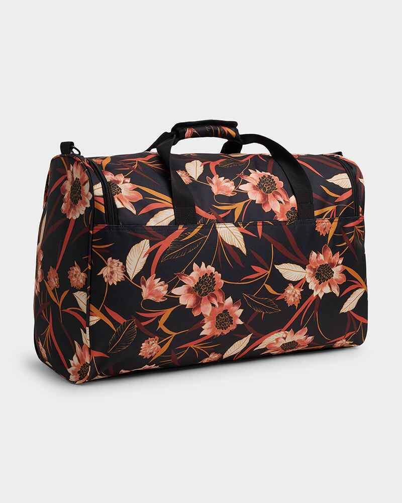 100% Polyester. This bag forms part of our travel collection, being the perfect size for a weekend getaway it is carry on compatible measuring 35.5cm H x 55cm W and has an unpacked weight of 0.67kg. The black based floral print is printed on a durable 600D Polyester featuring black metal hardware. The Long Island Weekender includes a detachable and adjustable shoulder strap, lockable zip pulls and has a 45L capacity.