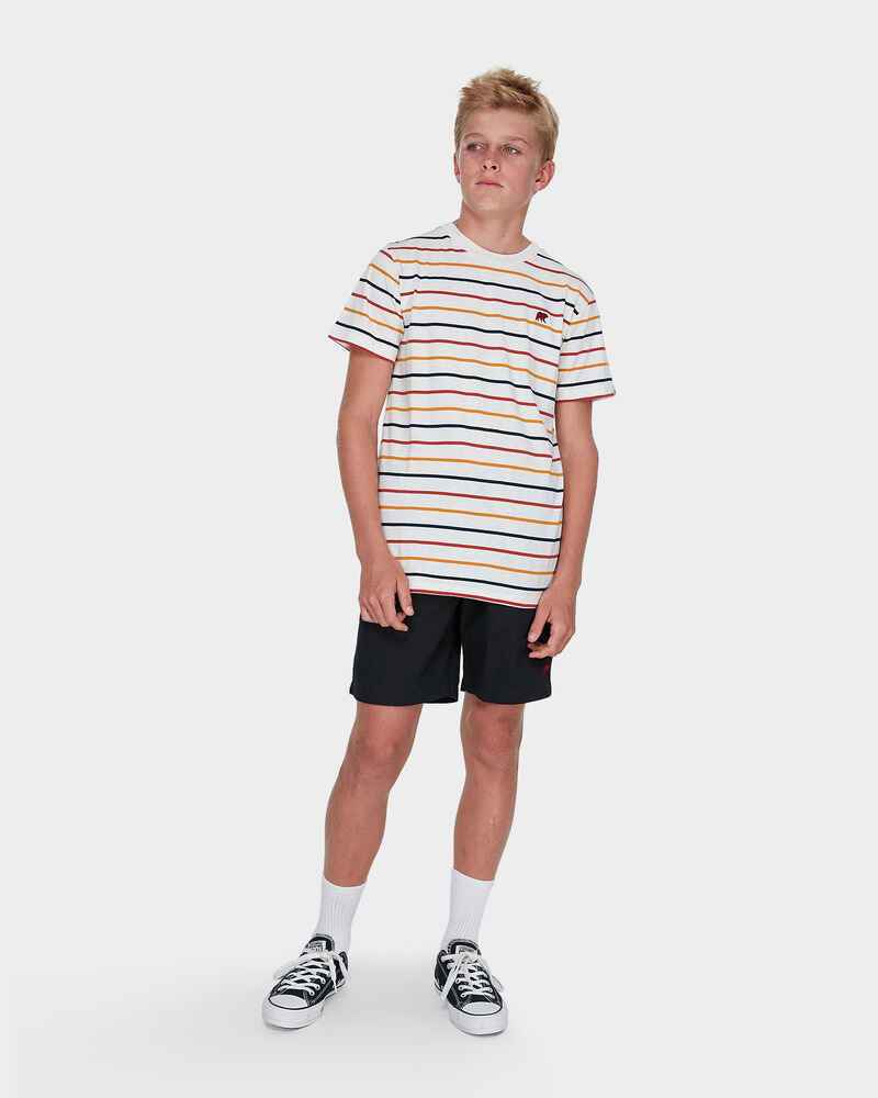 Youth cotton S/S T-shirt in yarn dyed stripe cotton jersey with embroidered left chest artwork and woven logo label at left sleeve hem.