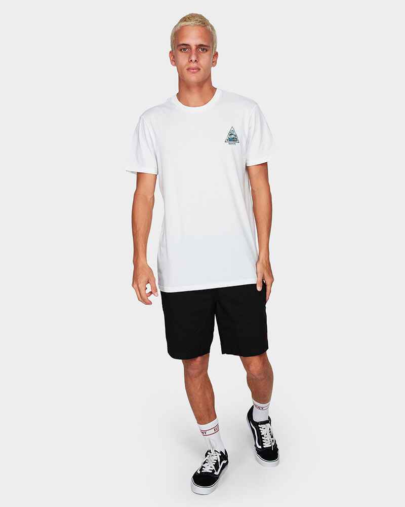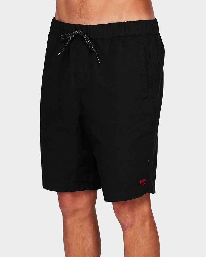 Men s relaxed fit short featuring elastic waist with side welt pockets and back patch pocket and finished with a left hem embroidery and woven label at the back pocket. 18.5 inch leg length.