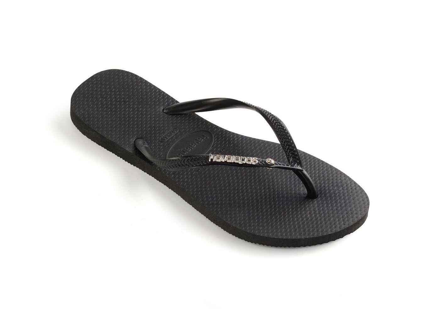 Havaianas Slim Metal Logo Crystal Black. Put some sparkle in your step! Brazilian rubber, a polished silver metal logo and a Swarovski crystal embellishment.