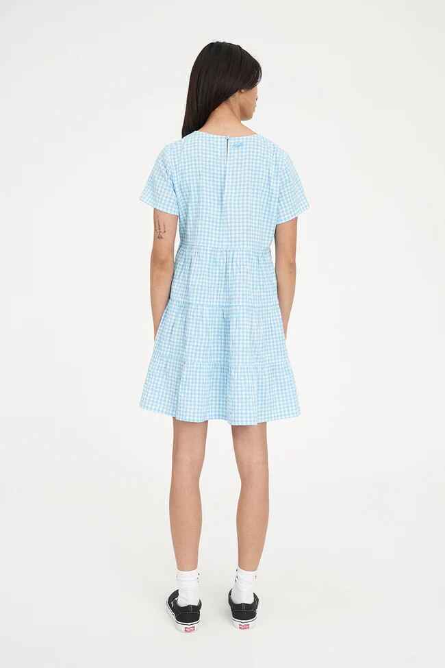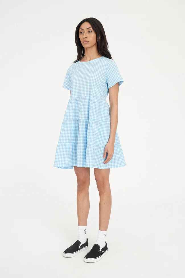 • What you need to know: 95% Cotton 5% Elastane, 140gsm, Custom Huffer gingham, Relaxed fit, Short sleeves, Keyhole closure at back neck, Tiered skirt, Side seam pockets, Mini length, Huffer branded placement embroidery