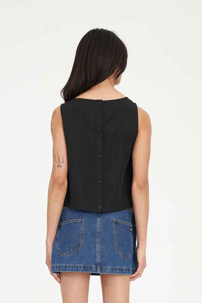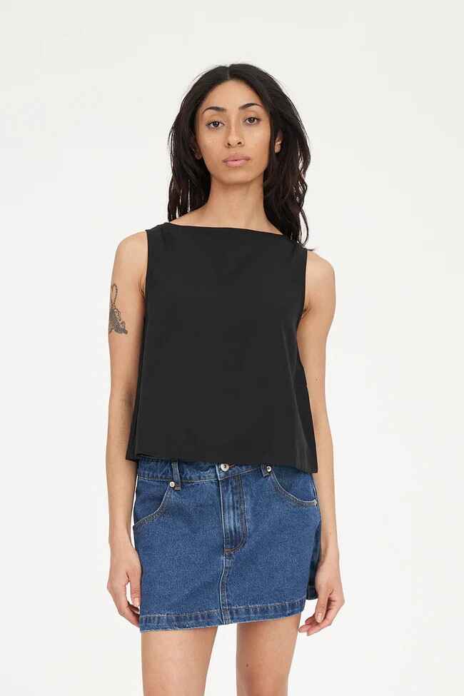 • What you need to know: 70% Tencel 30% Linen, 170gsm, Loose fit, Back button placket, Boat neckline, A-line hem, Sleeveless, Huffer branded placement embroidery
