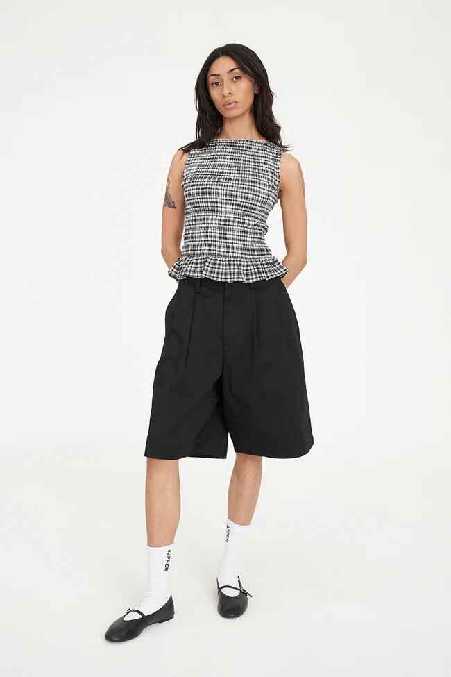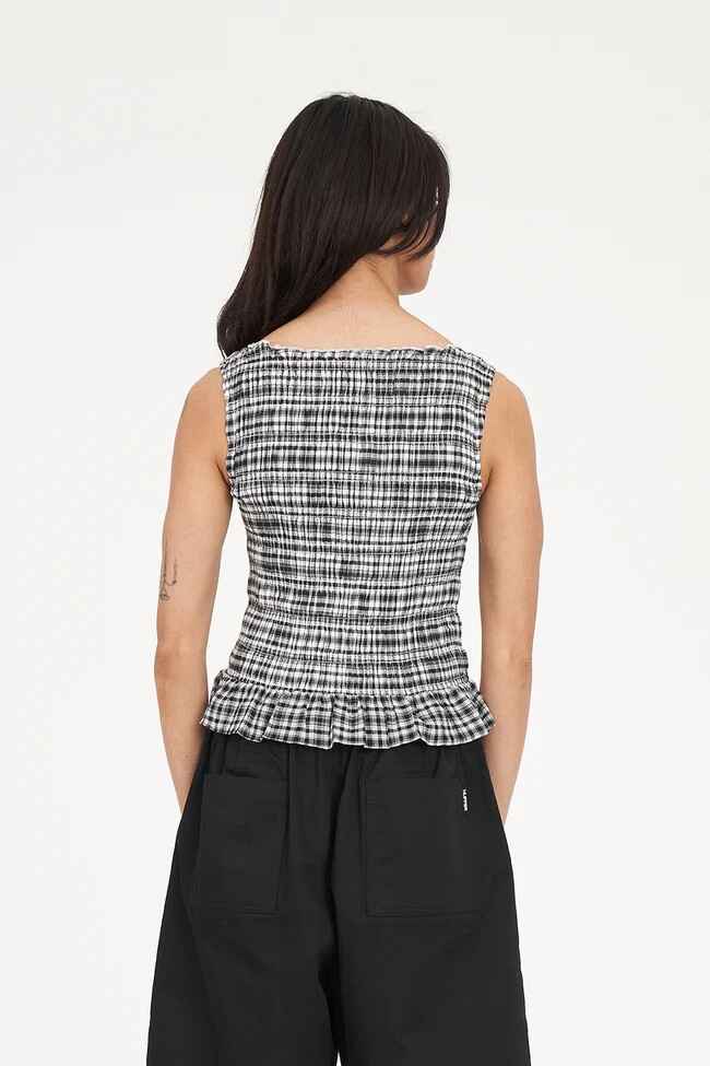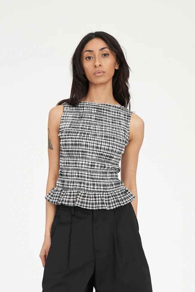 • What you need to know: 100% Cotton, 60gsm, Lightweight check, Crew neckline, Sleeveless, Shirred bodice, Hem ruffle, Huffer branded placement embroidery