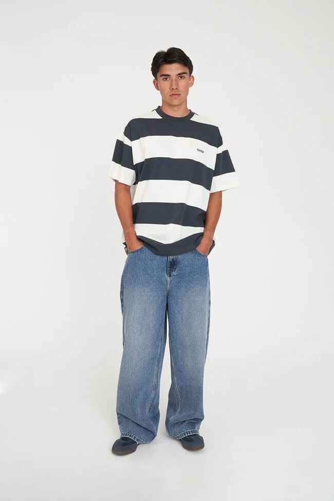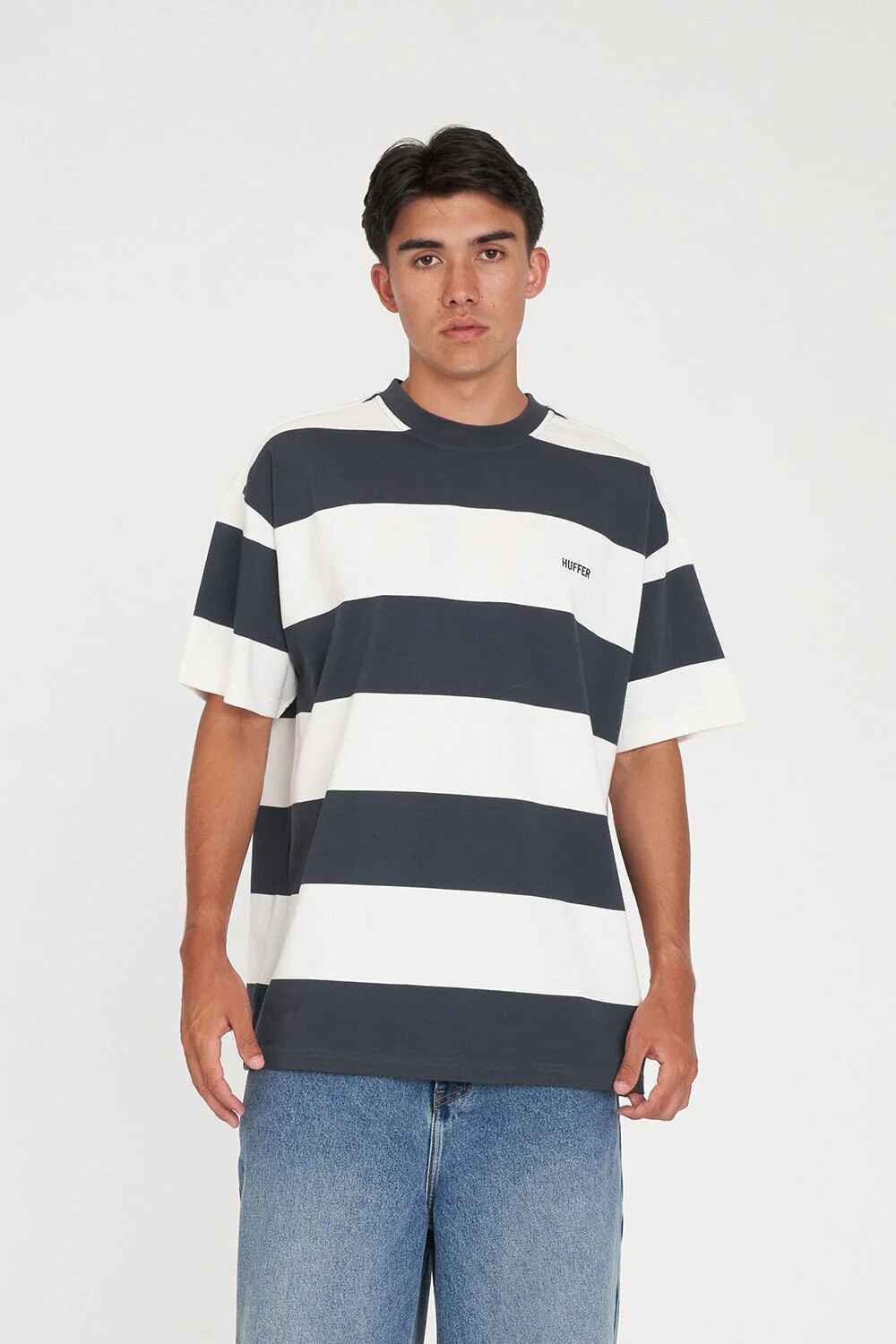 • What you need to know: 100% Cotton, 280gsm, Rugby knit, 25mm Neck rib, Custom Huffer yarn dyed stripe, Relaxed fit, Short sleeve, Huffer branded placement embroidery