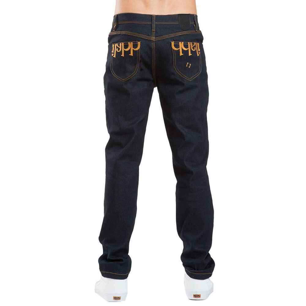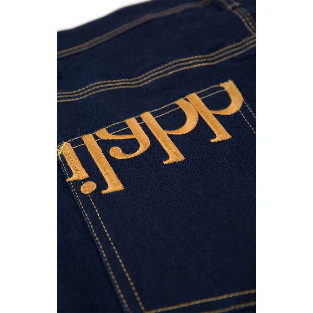 straight fit jean. waistband PU patch. ilabb capsize detailing on back pockets. internal contrast binding and pocket bags.