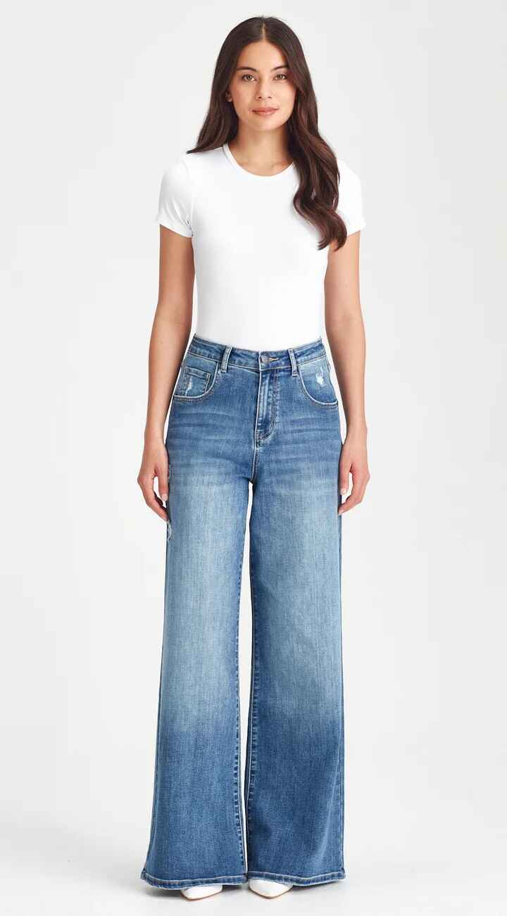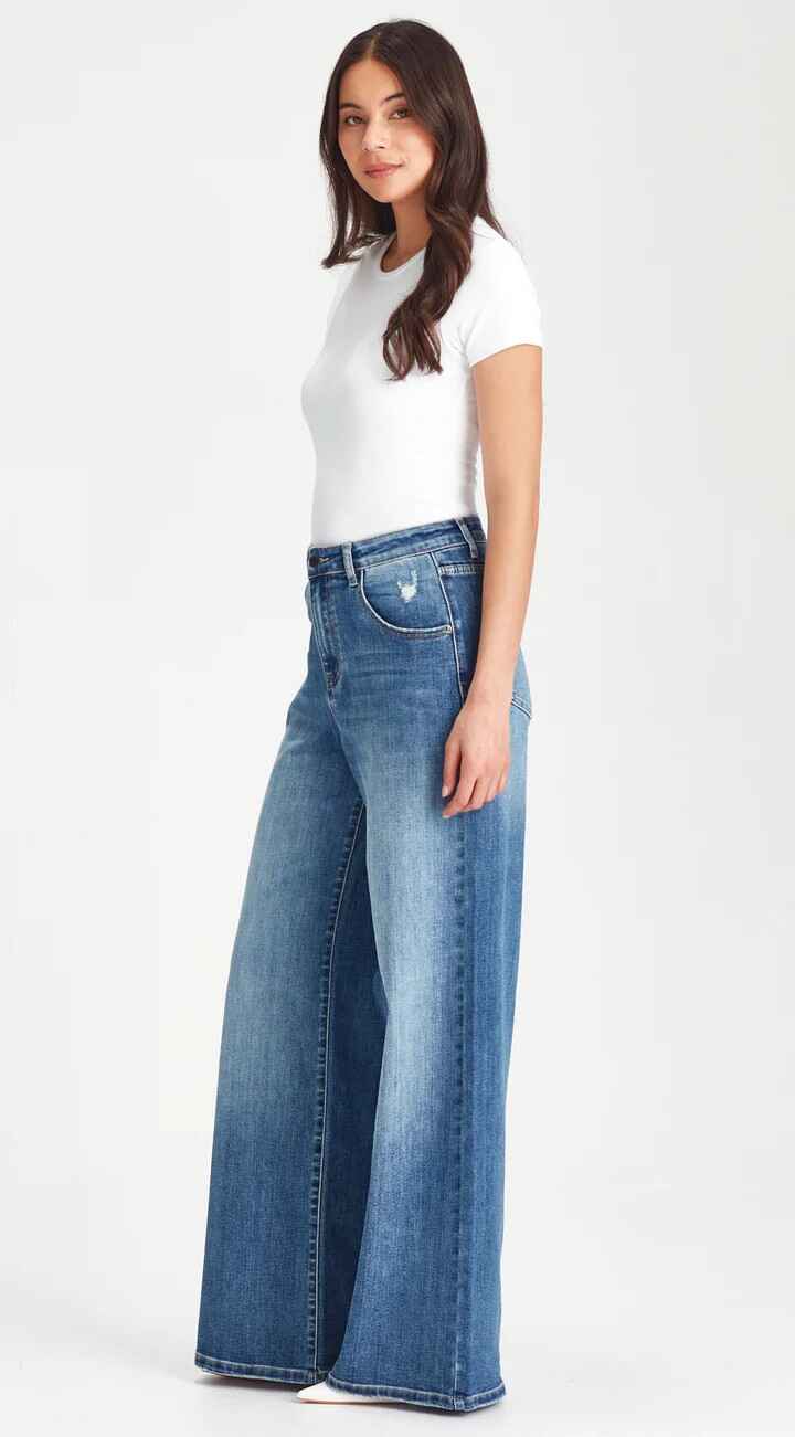 High waisted, stretch denim super wide leg jean.