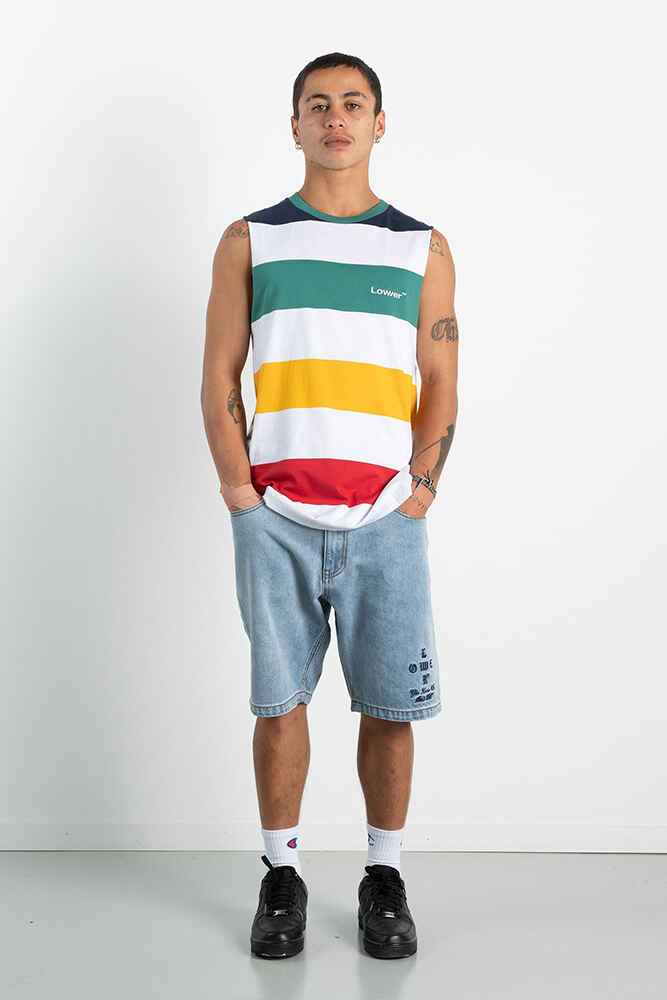 Lower presents the Men's Lowcase Tank in navy/white/red/green/gold stripes.