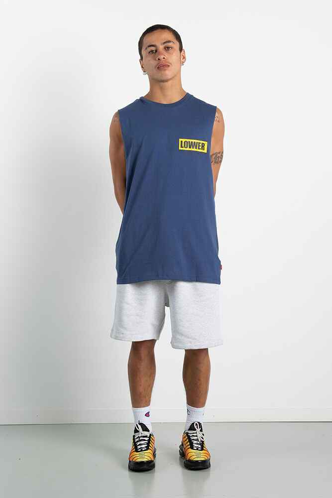 Lower presents the Men's Top Rope Cut Tank in blue.
