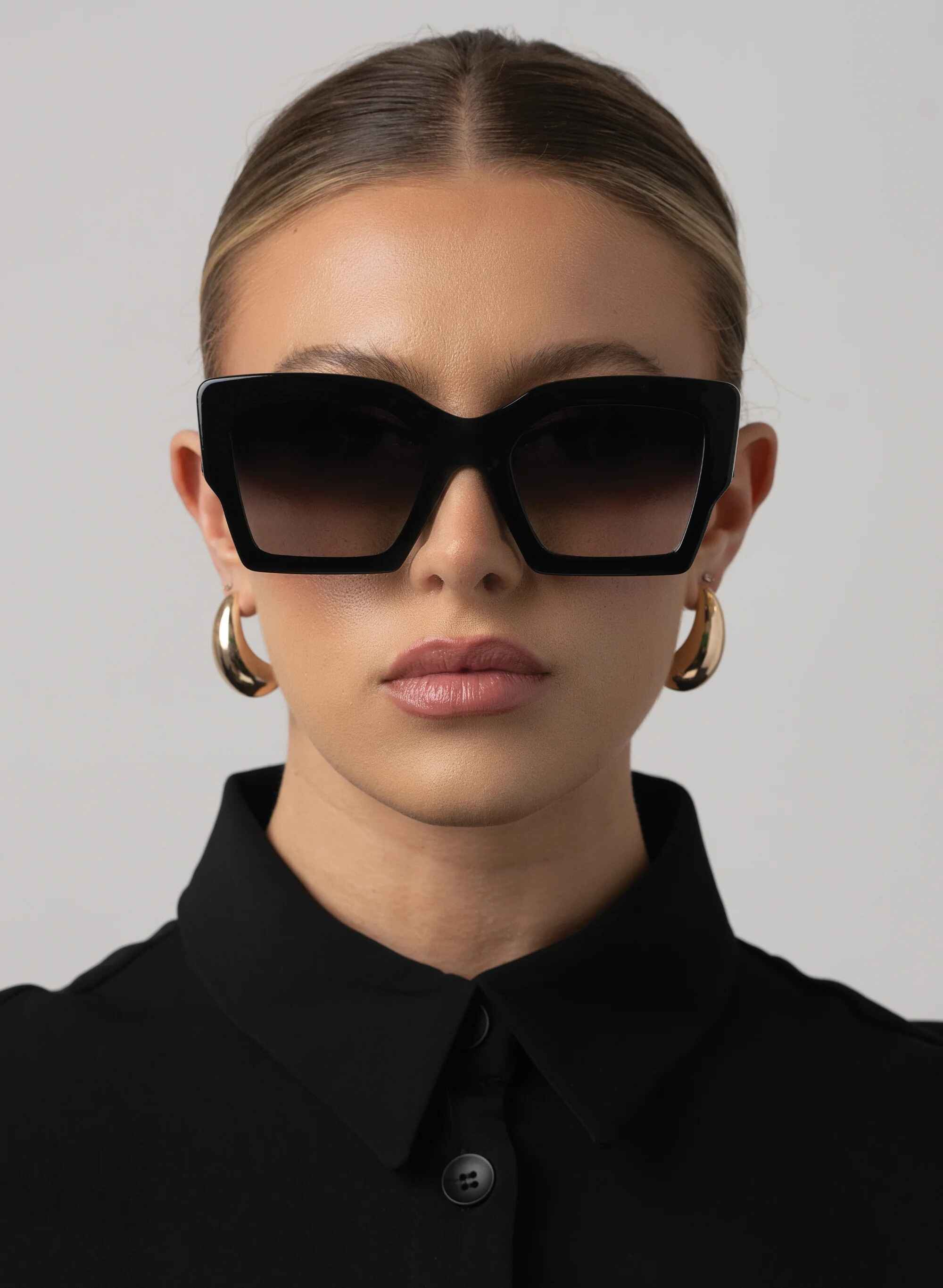 A squared, thick angled cat-eye silhouette in polished black, designed to command attention. Paired with gradient smoke lenses.