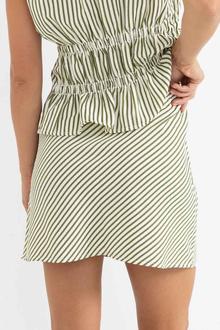 Designed with a flattering bias cut, the Cove Stripe Mini Skirt in Aloe features an A-line shape and a self drawstring at the waist for a customizable fit. Perfect for sunny days, this skirt effortlessly captures a relaxed coastal vibe.