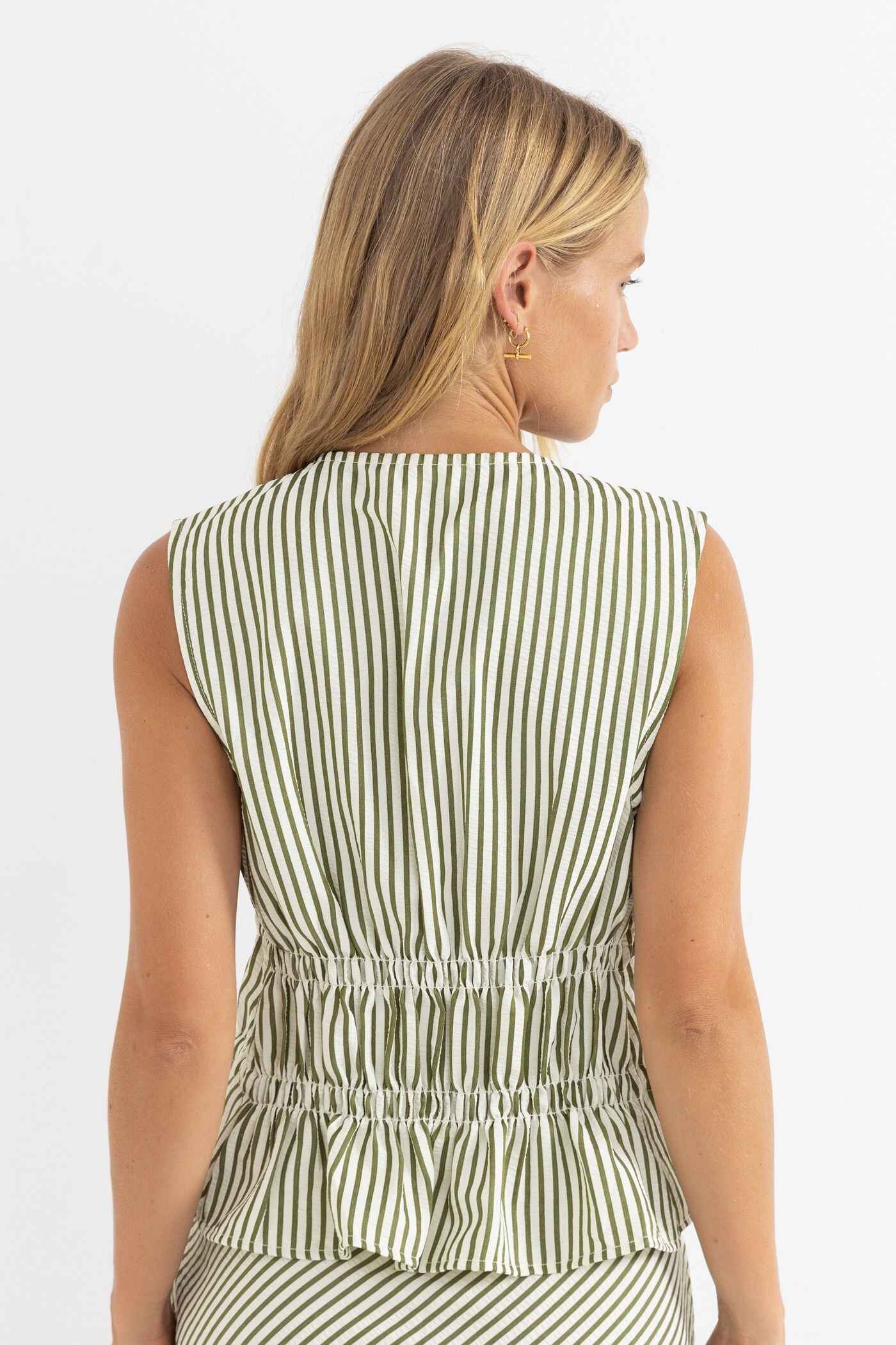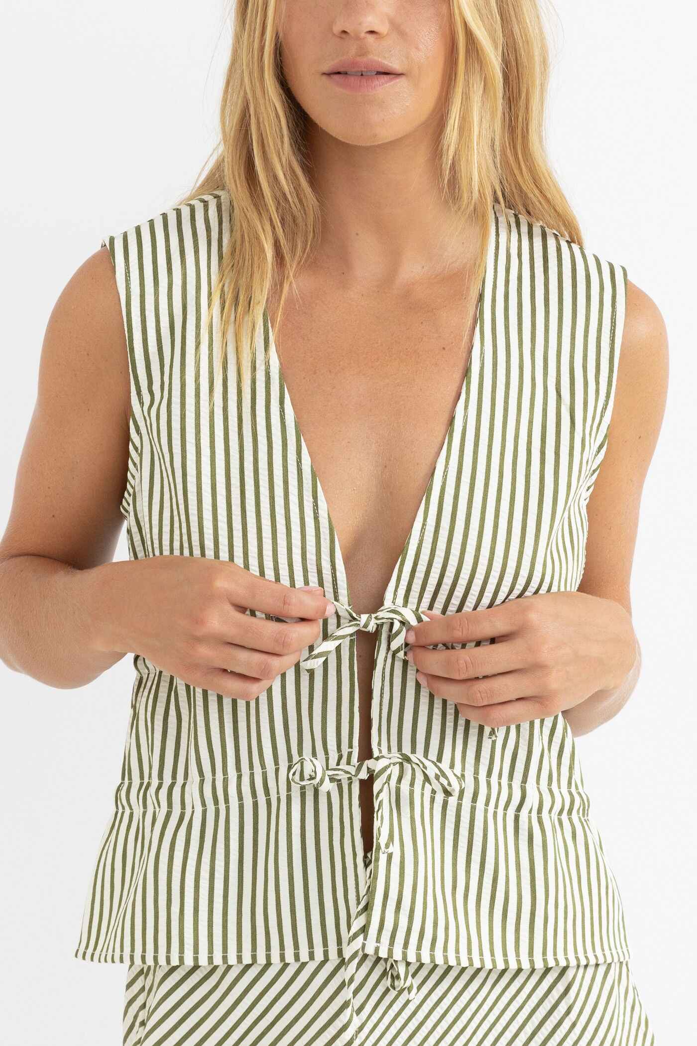 The Tie Front Top in Fire combines a sleeveless design with a front V neckline for effortless style. The easy fit and rouched detail at the body, along with adjustable drawstrings and a fluttered hem, make this top a standout piece.
