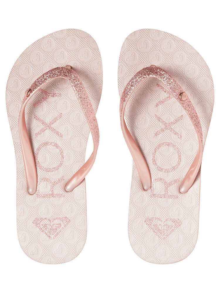 Girls' flip-flops constructed with an upper in TPR with glitter overlay and metal ROXY logo pin, featuring a footbed in textured rubber with printed graphic and glitter, and finished with an outsole in rubber.