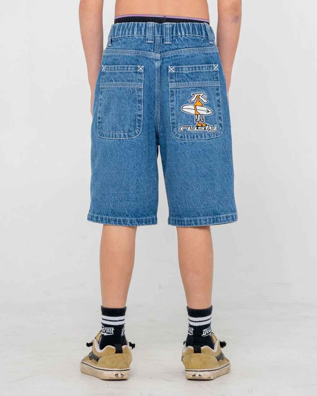 Baggy Fit Short With Half Elastic Waist & Rusty Embroidery. 100% Cotton Indigo Denim