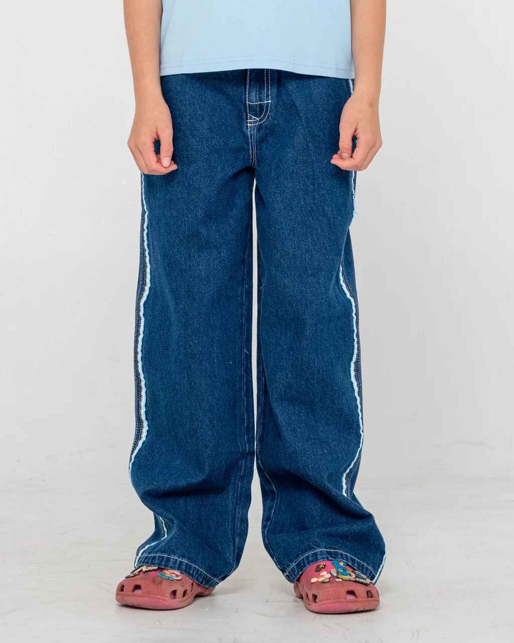 Low Rise Relaxed Fit Jeans With Embroidery Details. 100% Cotton Indigo Denim