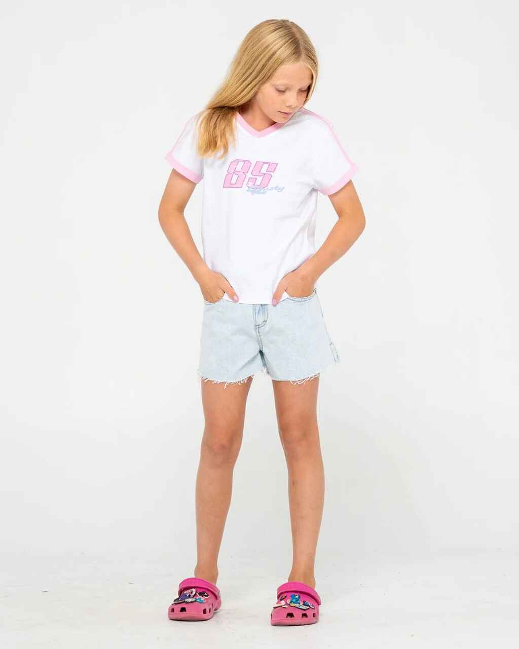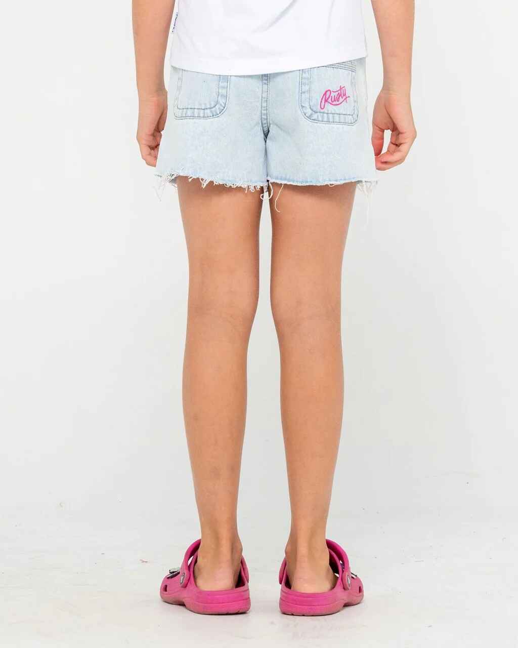 High Waisted Denim Short With Side Splits - Frayed Hem And Back Embroidery Logo. 100% Cotton Indigo Denim