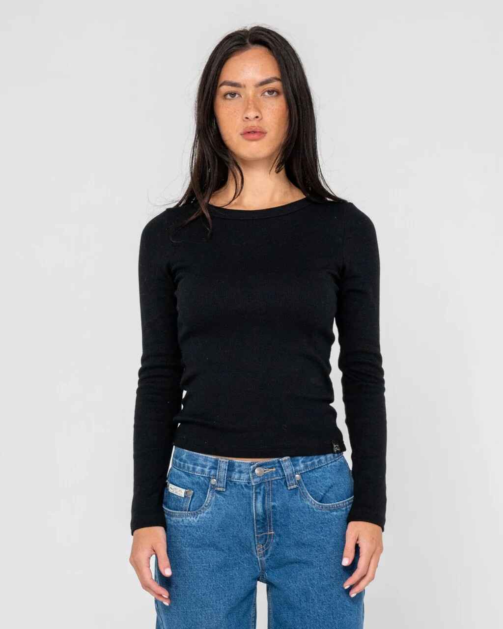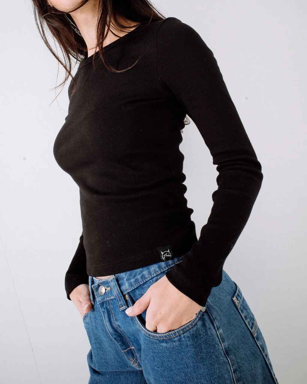 Long Sleeve Fitted Tee With Woven Clamp. 96% Cotton / 42% Spandex Ribbed Jersey Knit