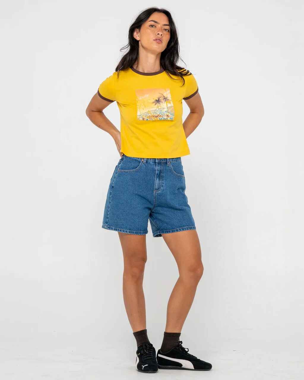 Short Sleeve Relaxed Mini Tee With Contrast Binding And Large Front Graphic. 100% Cotton Midweight Jersey