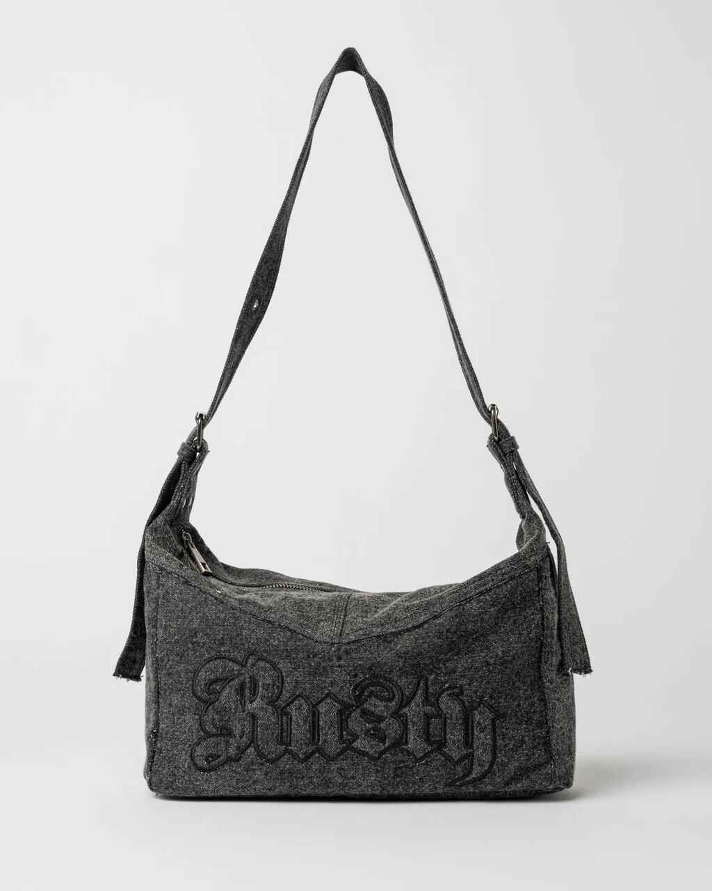 Washed Denim Shoulder Bag With Buckled Strap And Frayed Edges And Front Applique. 100% Cotton Washed Denim