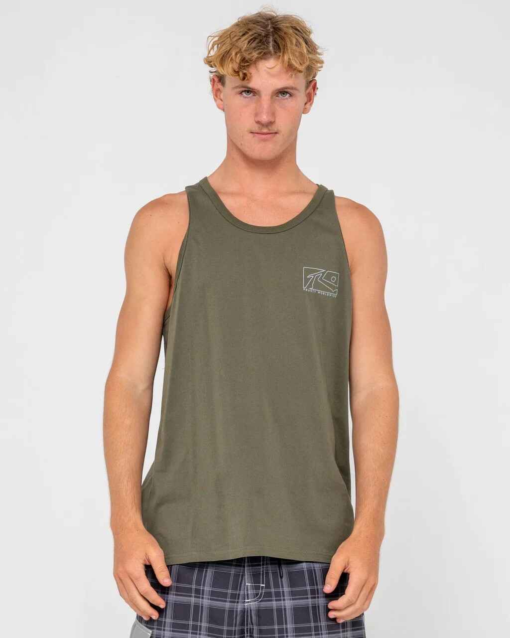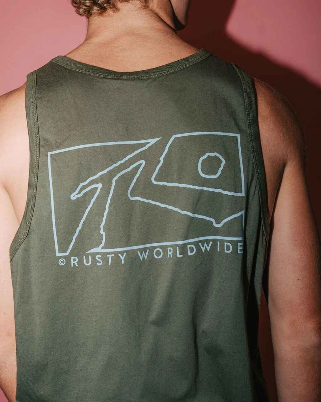 Standard Fit Tank With Rusty Chest And Back Print. 100% Cotton Midweight Jersey