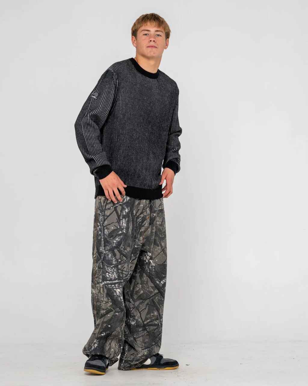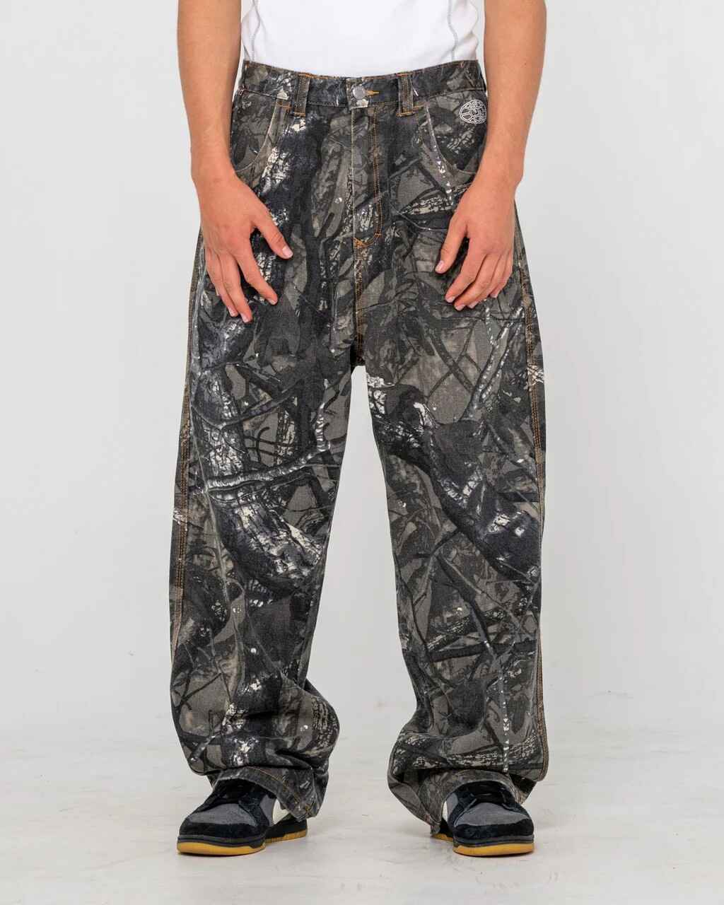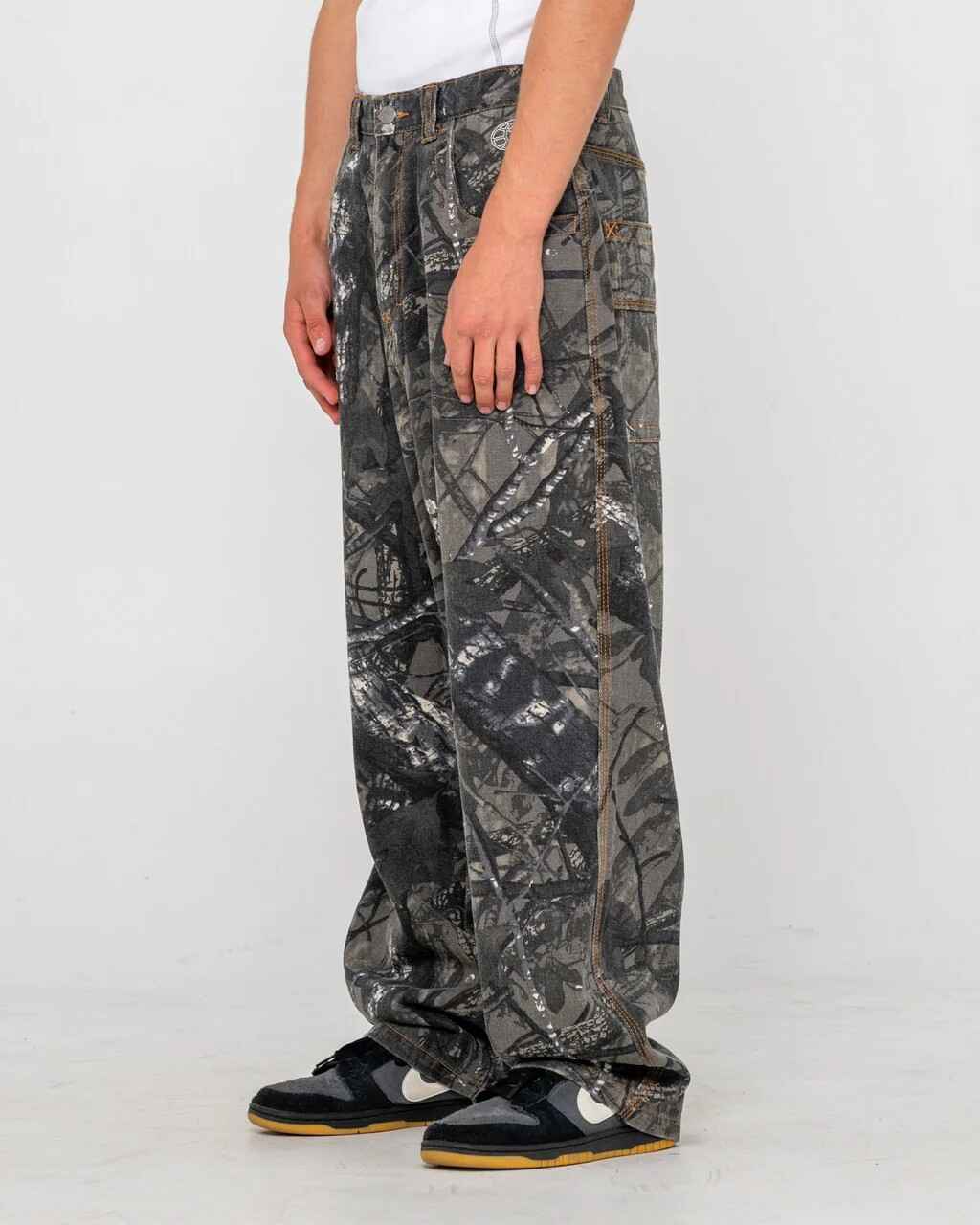 Baggy Fit Camo Pant With Ochre Contrast Stitch And Rusty Embroidery. 100% Cotton Camo
