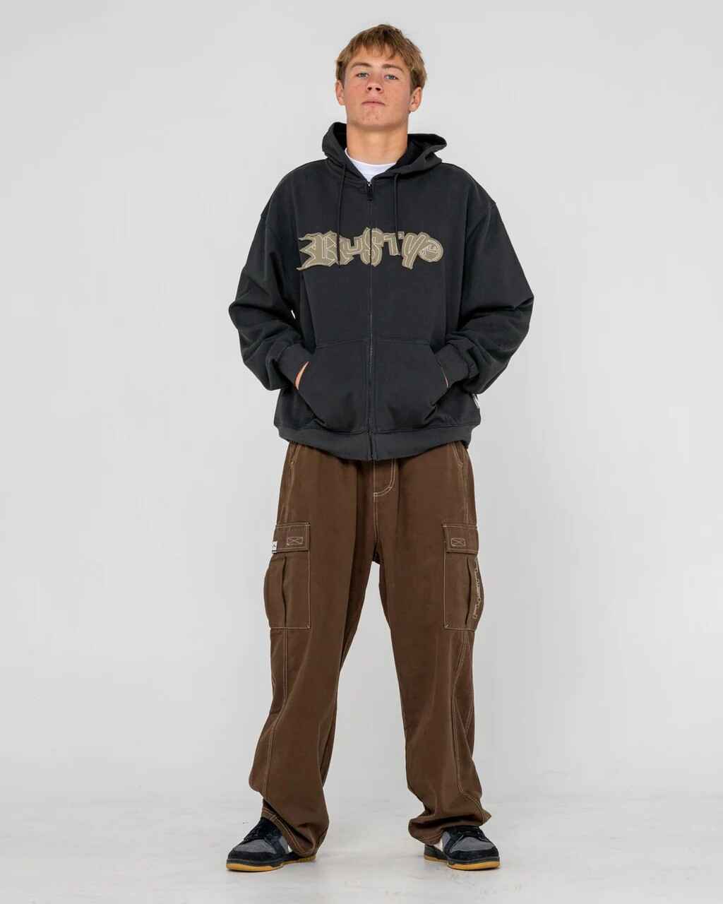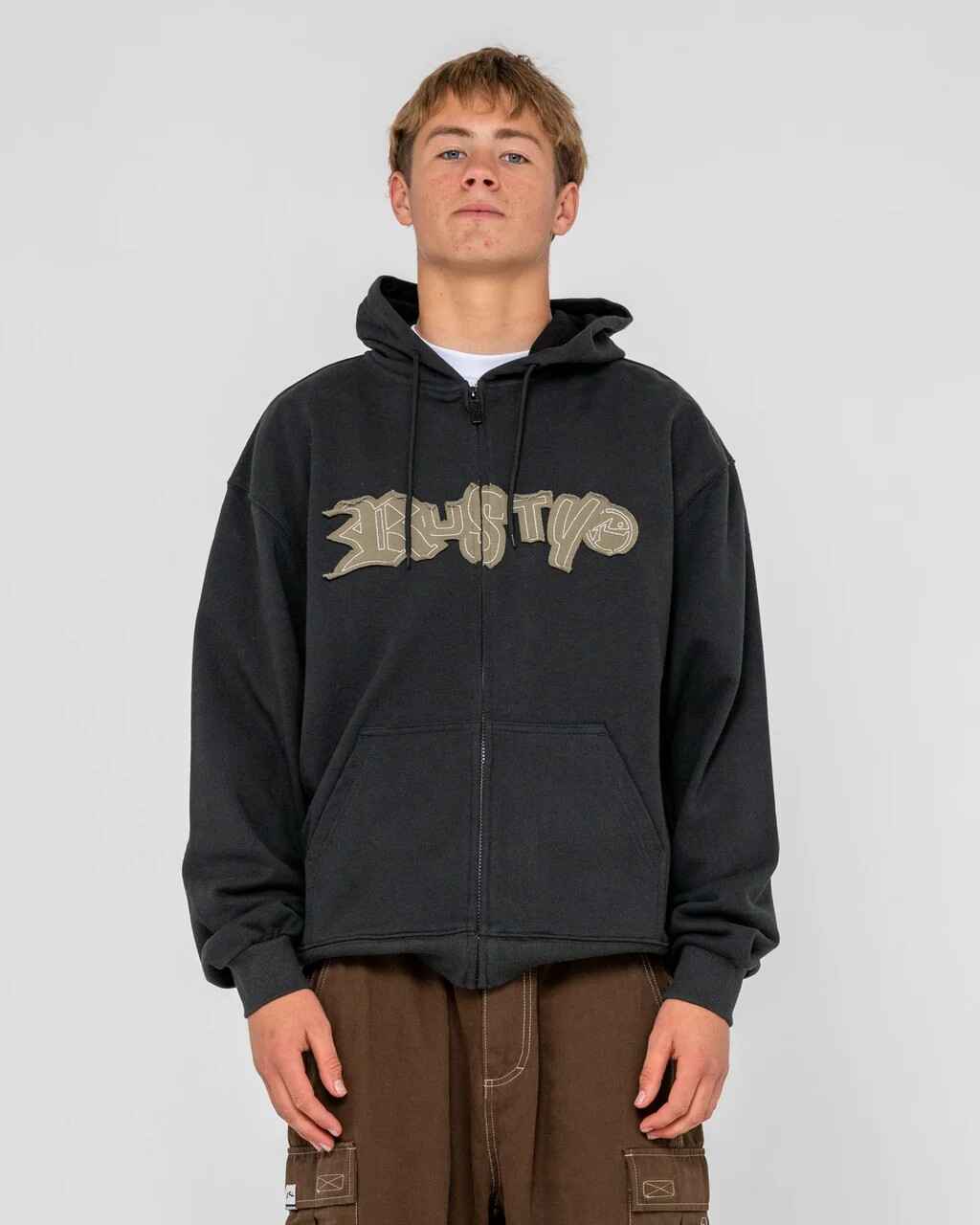 Relaxed R2K Fit Zip Thru Hooded Fleece With Rusty Chest Applique. 100% Cotton Fleece