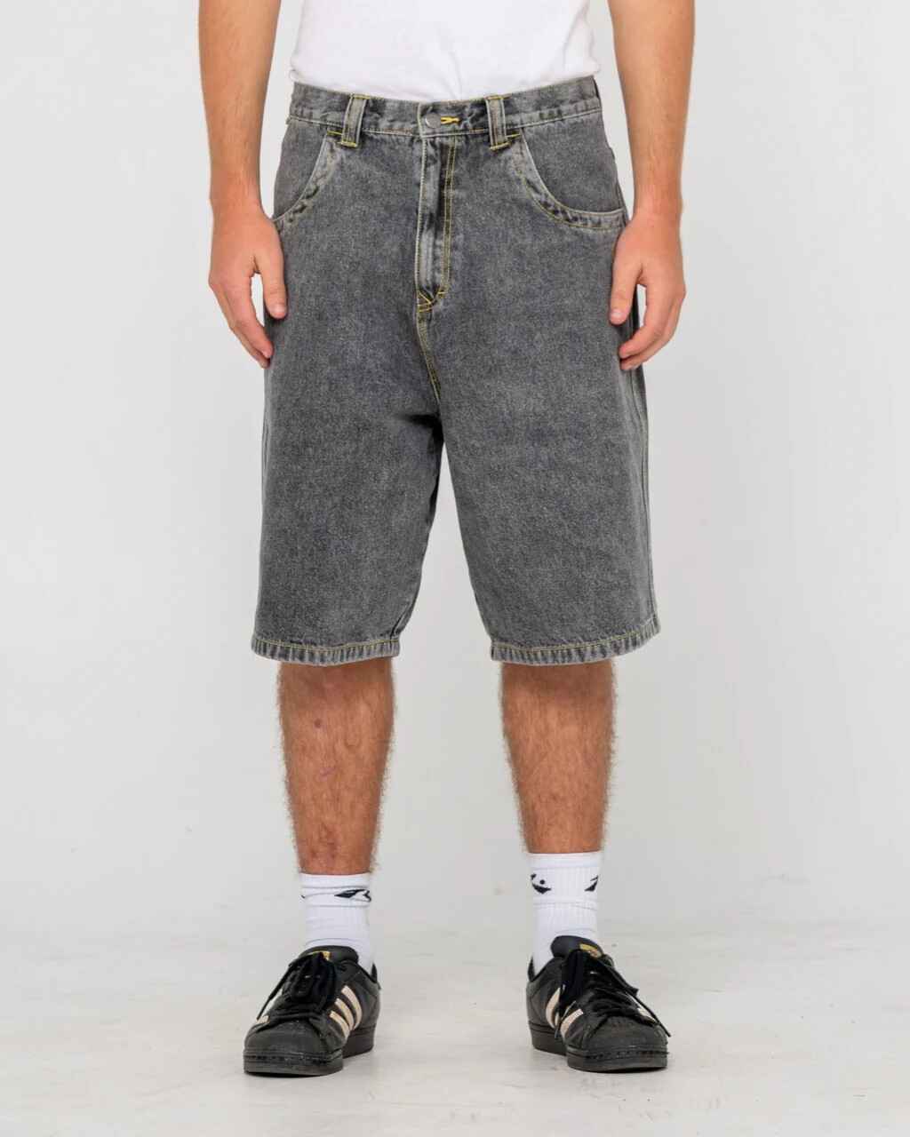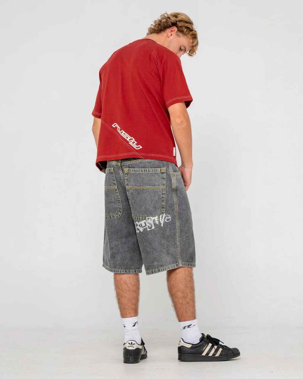 Baggy Fit Jort With Lemon Yellow Topstitch And Rusty Ransom Screen Print. 100% Cotton Indigo Denim
