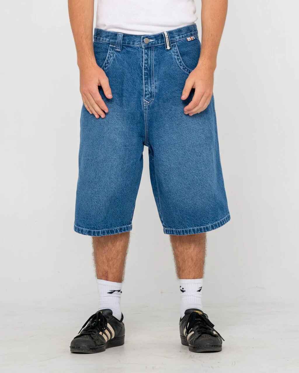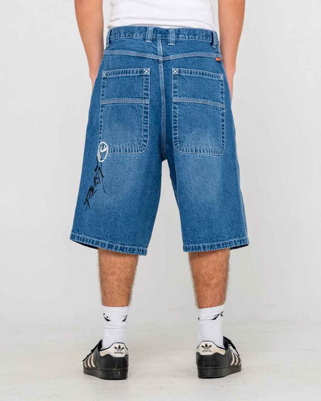 Extra Long Baggy Fit Jort With A 26 Inch Outseam And Rusty Print Embroidery Logo. 100% Cotton Indigo Denim