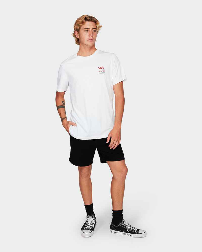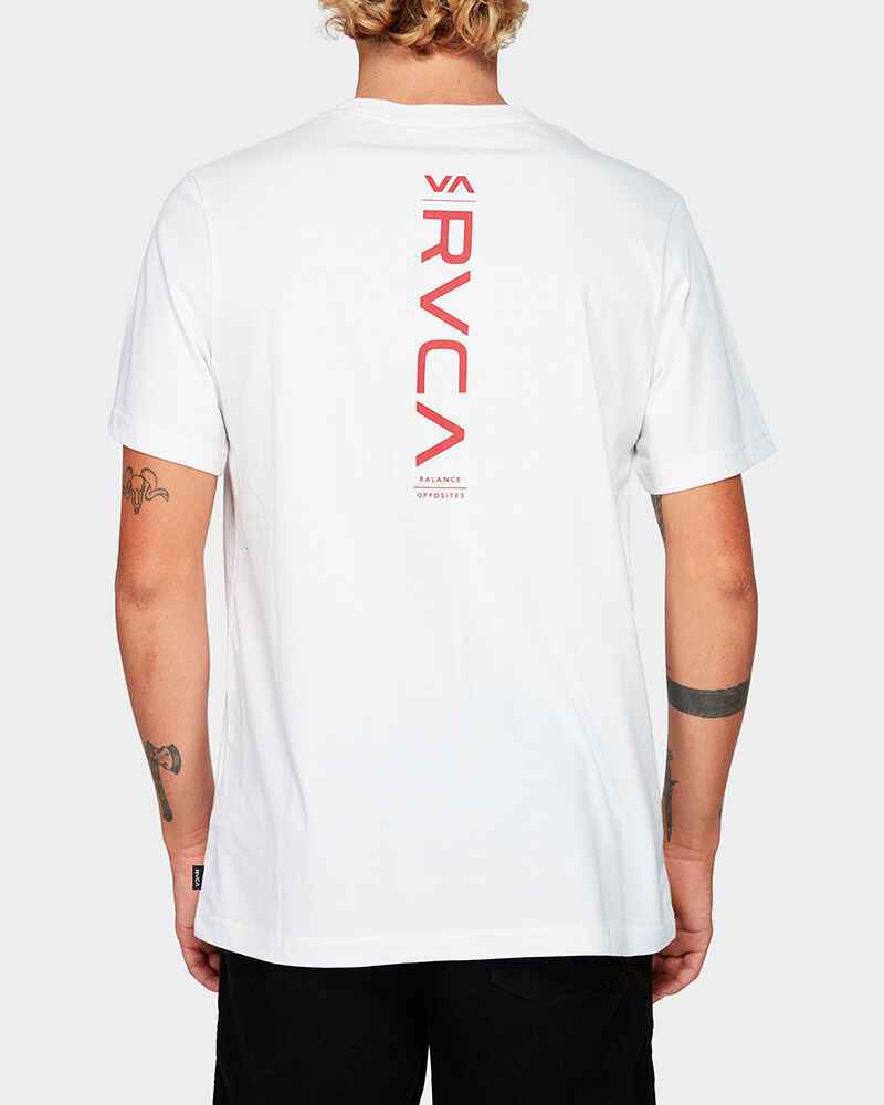 This standard fit tee features RVCA printed logos at front left chest vertically down back, short sleeves, RVCA vertical woven label at side seam finished with garment wash.