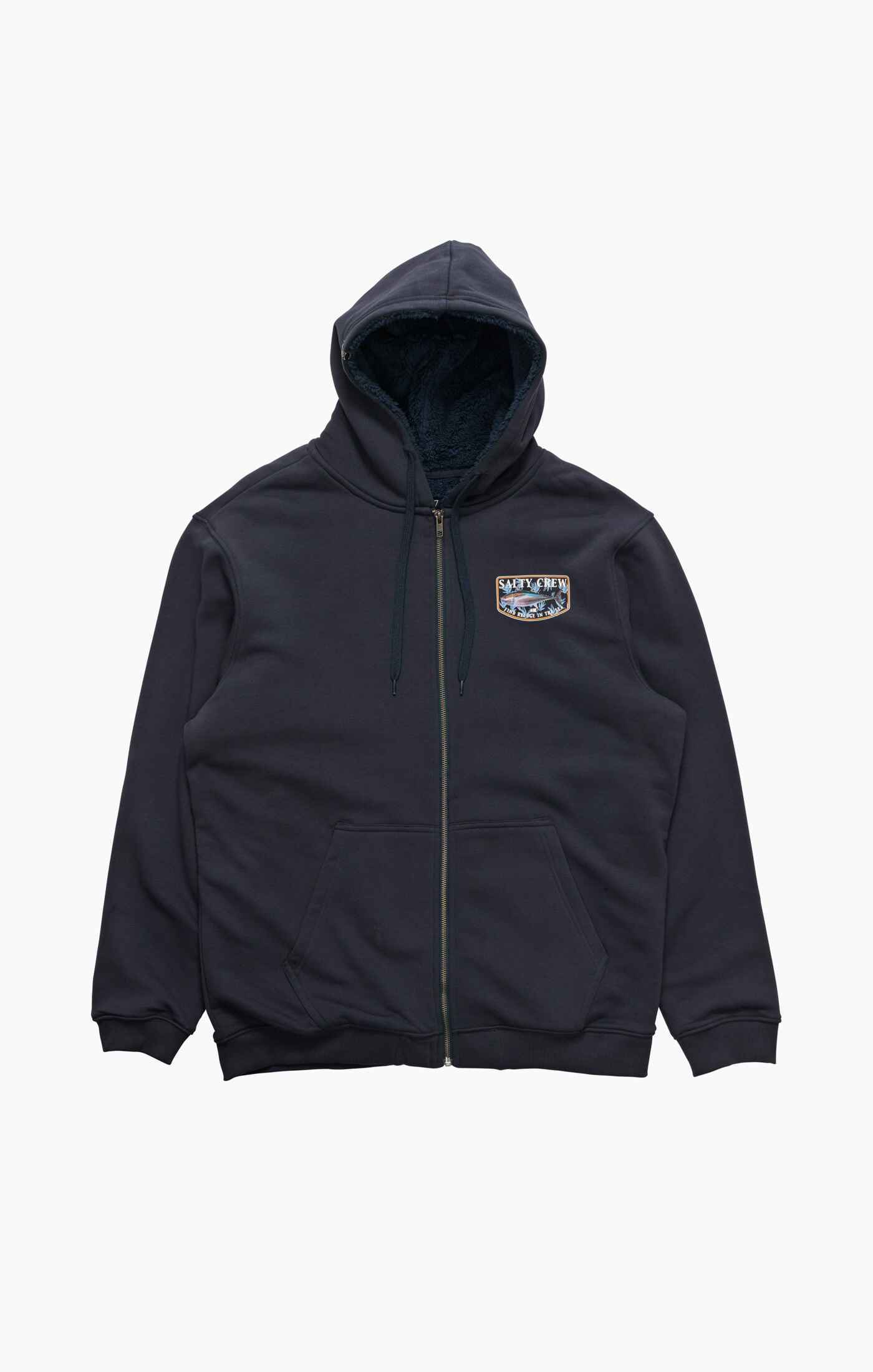 Rotor Fleece Lined Zip Thru in Vintage Black is made from our signature Cotton/Polyester Brushed Fleece, 300gsm in weight. Faux-shearling lined body, two-piece hood with encased drawcord, rib knit cuffs & hem, self-fabric kanga pocket, metal zipper at centre front & Salty Crew clamp label at hood opening. Screen printed front & back prints.