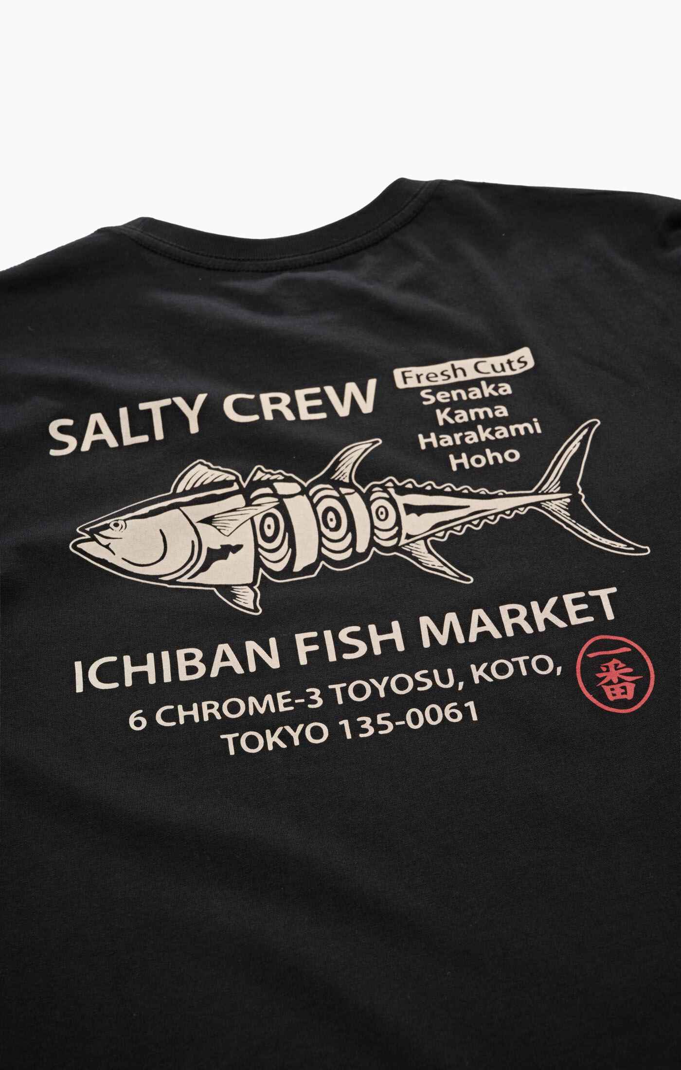 Ichiban Premium SS Tee in Black is made from soft spun cotton jersey, 160gsm in weight. Finished with Salty Crew clamp label at sleeve hem. Screen printed front and back prints.
